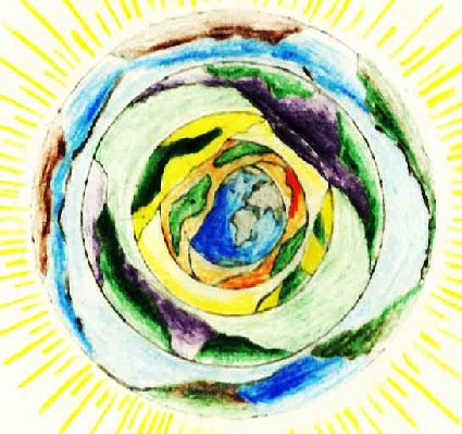 here showing inmost our known earthlevel - most people beliving the only one existing. Outside this there are higher frequency levels/plans as layers in an onion. The outer penetrates the lowers. There are special dim.gates connecting the different levels together - where most ufo's enter our level or world.