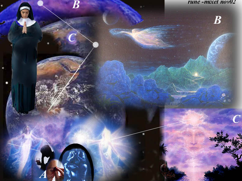Bønn - som er telepatisk oppkopling til overselvet og særlige åndelige hjelpere. Julie - en åndelig bevisst kvinne ber for sin bror A som har store personlige problemer - han har derfor begynt å drikke som trøst. Dette i seg selv tiltrekker en rekke avdøde/astrale alkoholikere (som knapt vet de selv er døde) som går inn i personens aura og der forsøker å snylte rus - og slik stimulerer ham ubevisst til drikking - men disse "snylteånder" er dog ikke illustrert her. Han har selv et overselv på et høyere plan - C - som han dog ikke har noen dagsbevisst forbindelse med (dette er her symbolisert med kun stiplet linje mellom A og hans overselv). Han er en vanlig materialist som ikke tror eller VET noe om de høyere plan eller om sin egen sjel/overjeg. Han er selv ansvarlig for å knytte denne forbindelse til overselvet BEVISST, men i mangel av dette, mottas begrenset hjelp fra C. Men hans søster aktiviserer høyere-dimensjonelle åndelige hjelpere (såkalte engler) via sin bønn - samt henns eget overselv (vesenet vist under Julie). Alle disse har evne til å virke på flere dimensjonsplan, og disse oppsøker broren og prøver å åpne opp hans lukkede aura/tankefengsel og stimulere fram noen nye, konstruktive tanker. De kan også kontakte enda "høyere" vesener på plan B og "lenger opp" om nødvendig. Mer om temaet på linkene her og her og delvis i bokutdragene her.