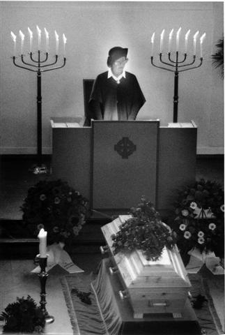 ![]() fra Bente Alvers minnetale over her. Westerlunds siste hilsen?Kameraet gikk av uten at fotografen rørte ved det - på bildet t.v. blåste lysene hver sin vei. Hva skjedde i Anna Elisabeth Westerlunds begravelse? av Siv Sæveraas (Denne saken er hentet fra BTMagasinet 11. oktober 2009. ) Daværende VG-fotograf Tom Egil Jensen hadde tatt oppstilling på galleriet i Vestre gravlund kapell for å dekke begivenheten. På grunn av lite lys, hadde han plassert kameraet sitt på et stativ. Mange år tidligere hadde Jensen, da han jobbet i Demokraten, vært på spøkelsesjakt med Westerlund. Han hadde stilt seg undrende til at hun kunne forutse sin egen død, og Westerlund sa da til ham: «Etter min død skal du få et tegn fra meg». Under Bente Alvers minnetale konstaterte Jensen med forbauselse at kamera gikk av, uten at han berørte det. Da han kom tilbake til avisen oppdaget han at et av bildene på filmen skilte seg ut fra resten: Lysene på kandelabrene på hver side av Alver blåste oppover og utover - i hver sin retning. - Avisen undersøkte om det kunne ha vært noe spesielt med trekken i rommet på dette tidspunktet. Det var det ikke. Det som hendte er rett og slett uforklarlig, sier Tom Egil Jensen.