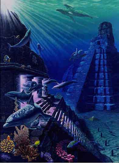 et nytt kunstbilde av ufos under vann der de "dykker" ved undersjøiske bygningsrester fra ATLANTIS - SENERE I BOKEN SKAL VI SE AT ANTE FÅR LOV Å BESØKE  EN UNDERSJØISK BASE HER  PÅ JORDEN.