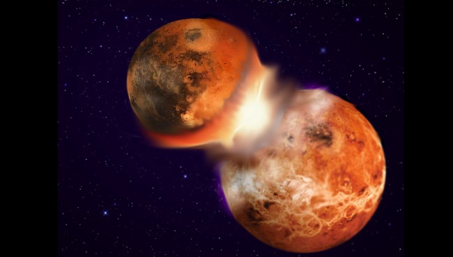 This image depicts the catastrophic collision of two planetary bodies similar in composition that led to the formation of the Earth and its moon 4.5 billion years ago.