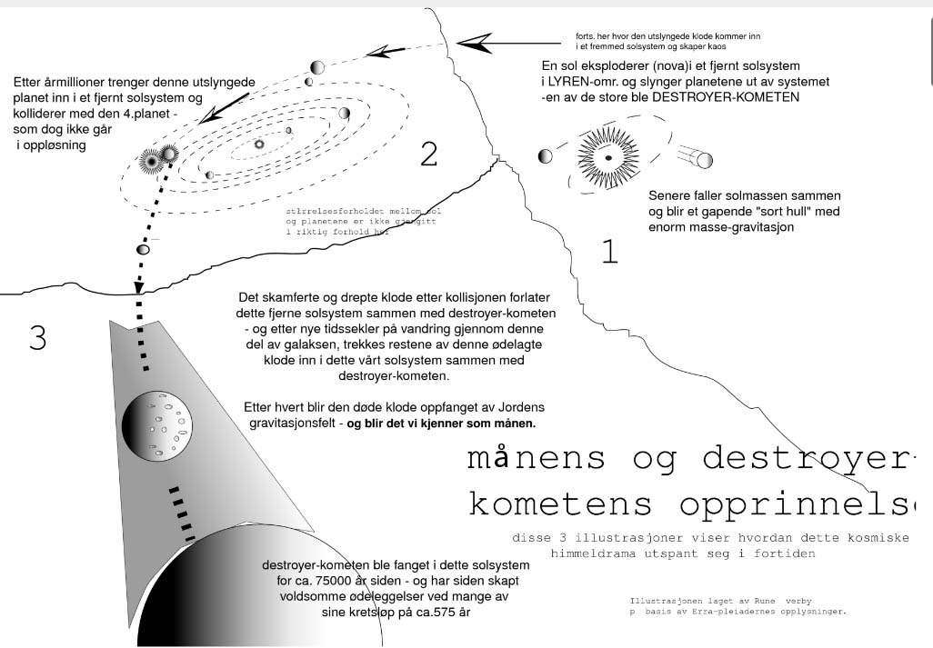 475 Many millions of years ago, the earth-moon was torn off by the destoyer, as a fragment of a planet about 4 mill.years older than Earth, and hurled out into space, into a course towards the sol-system, where it then was captured by the Earth as satellite.
