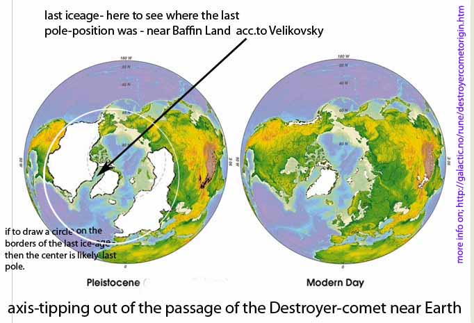 Destroyer breaks into the earth orbit, disturbs it- Earth - in its own rotation, and in its orbit around the sun, causing tremendous Earth quakes, volcanic outbreaks and volcanic outbreaks, floods and elementary storms, wherein the biblical deluge fellows from the occurrence (this doesnt concern the deluge of noahs ark) The Earths own rotation is changed and a pole shift occurs.