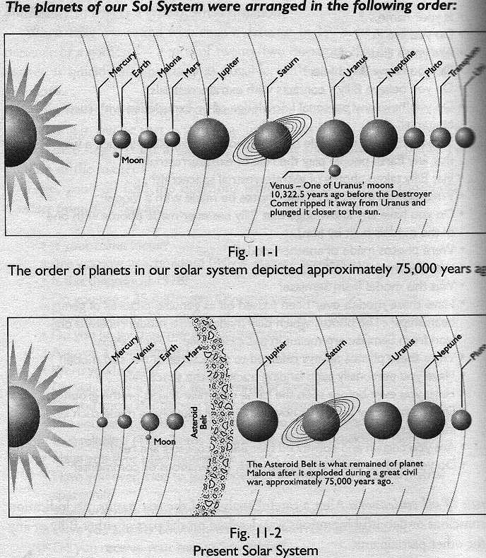 6. Meier: yes, indeed, i must have overseen this, will take notes. -So,1511 BC to 733 BC, a very bright and wandering planet, 1,4times size of Earth's moon breaks into the solsystem. Coming from an unknown origin, it bursts out from outer space and breaks into Venus' orbit, in order to disturb its course. Afterwards, it passes very closely by the Earth and disturbs its orbit and balance, wherewith the Earth , during the next 158years, is disturbed several times by the accompanied returning wanderer, and even is turned around in its rotation. All of this is accompanied by apocalyptic catastrophes, wherewith the points of the compass and the Earth's yearly cycle around the sun is changed, so the orbit time slowed down to 284days. Worldwide conflagrations, earthquakes, deluges and volcano eruptions were the consequences and left their traces on Earth. Fragments of continents and islands sank onto the seas, while new land fragments rose up. Well, this time I also have this data. I may have been quite innovative when I copied off your recordings and overlooked this information.