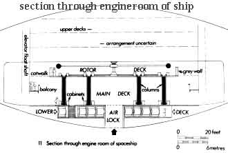 There must, he realised, be another space, at least around the centre, between the flat part of the floor and the outer hull; and when we came to make drawings we understood that, in the middle, this lower space must accommodate the large airlock; there is, in fact, deck space around the airlock which John did eventually get into.