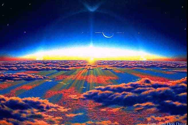 Etter hvert som jeg red videre og videre på strømmen kunne jeg omsider se et enormt Lys komme. Jeg visste at det var det Første Lyset; Lysmatrisen til vårt solsystems Høyere Selv. Så kom hele solsystemet til syne, akkompagnert av disse dempede lydmursdrønnene. Jeg kunne se at solsystemet vi lever i er vårt større legeme. Det er vårt legeme, og vi er mye større enn vi kan forestille oss. Jeg så at solsystemet er vårt legeme. Jeg er en del av dette, og jorden er dette store skapte vesenet vi er, og vi er den delen av det som vet at den er. Men vi er bare den delen av det. Vi er ikke alt, men den delen av det som vet at den er.