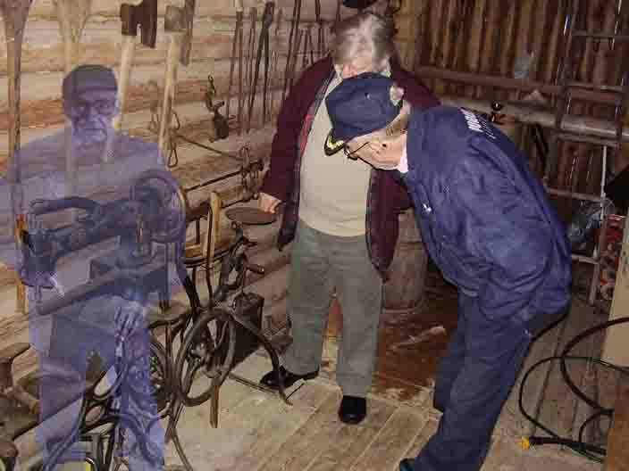 gamlefar (t.v) er tilstede og passer på de gamle ting han samlet på, men ER BLITT USYNLIG for andre, slik han tolker det - for HAN SKJØNNER først IKKE HVORFOR HAN IKKE LENGER FÅR KONTAKT MED "SLEKTA" - MEN han forstår gradvis at han er død, og når han begynner å åpne seg for hjelp, kan han ledes vekk til det naturlige stedet for "de døde" - hvilket er på et annet livsplan. (bildet er ikke fra boken som denne art. omtaler, men mix laget av RUNE Ø)