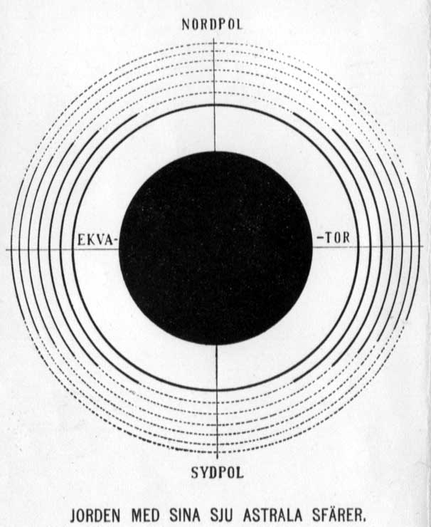 De sju astrala sfärerna. Vår planet, som jordemänniskan anser vara så skarpt begränsad af den sfäriska yta, på hvilken hon själf bor och färdas, är från astral synpunkt betraktad allenast en del af denna himlakropp, dess inre fysiska kärna. Jorden omgifves nämligen utanför sin fysiska kropp af sju koncentriska sfärer eller delar däraf, alla af astral materia af varierande täthet, alla absolut osynliga för det jordiska synsinnet. De ligga icke omedelbart på jorden eller på hvarandra, utan äro skillda åt genom ett astralt luftlager af varierande djup och täthet Hvarje sfär har en viss tjocklek och således en öfver- och en undersida. Dessa äro af jämförelsevis hård materia, inneslutande mellan sig en inre mjukare massa. Endast den första, närmast jorden belägna är en hel sfär, som på alla sidor omsluter jordklotet. De öfriga ligga som sfäriskt böjda, bredare eller smalare bälten rundt om ekvatorn och på ömse sidor därom, men lämna polartrakterna öppna. Sålunda sträcker sig: 2:a sfären till omkring 60 gr.bredd 3:e sfären till omkring 45 gr. bredd 4:e sfären till omkring 35 gr. bredd 5:e sfären till omkring 30 gr. bredd 6:e sfären till omkring 25 gr. bredd 7:e sfären till omkring 20 gr. bredd allt på ömse sidor om ekvatorn.