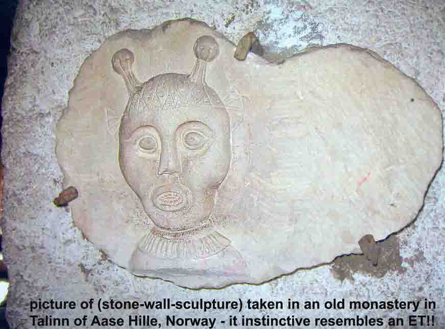in many of the Rampa books - ex THE HERMIT - it is mentioned ETs with horns-like things on the head, but just this picture may also be on a helmet -like cap on this "ET".