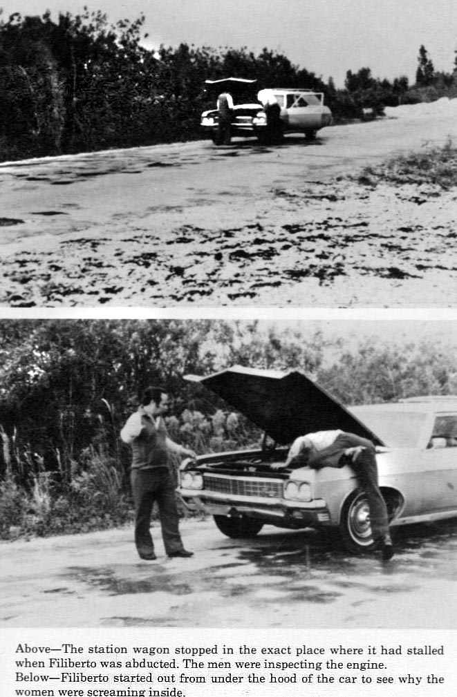 "At that moment the engine began to reflect different colors, red, violet, blue, orange and then a bluish white." They heard an intense buzzing noise, "like many thousands of bees," Cardenas said. "I tried to move but I was paralized in position, unable to do anything-even unable to move my arms. I could hear the screams of the women in the car. I looked down and saw that I was suspended in the air and rising. When I was 8 to 10 feet above the car everything went dark, and I don't remember what happened.