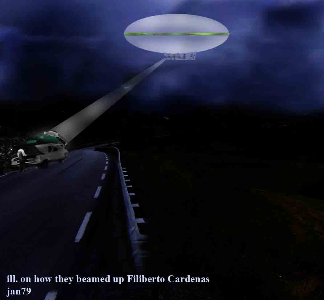 On the 3rd of January 79, at about six PM, a Thursday evening, Filiberto Cardenas, then 46 years old, was snatched by a buzzing object that emitted a beam of violet-bluish-white light which caused him to float up the beam and out of sight of his three friends with him. He seemed to go into a darkish bag-shaped (later described as roughly football-shaped) object which then flew away to the west with Cardenas aboard.