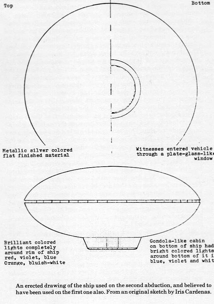 Although no spacecraft was actually seen on the first abduction, one was clearly observed by Filiberto and Iris the second time as it approached and hovered near their parked car in almost the same place as the first when Filiberto was snatched. The ship did not actually touch down, but hovered a few feet above the ground. It was as large as a refrigerated railroad car, roughly mushroom-shaped, and had a smaller gondola on the bottom. It was a dull silver-gray in color in the air until it "landed", and then a row of colored lights of blue, violet, silver and white came "on" and blinked all around the side of the mushroom-shaped larger upper part. More lights of the same colors blinked around the bottom of the gondola.