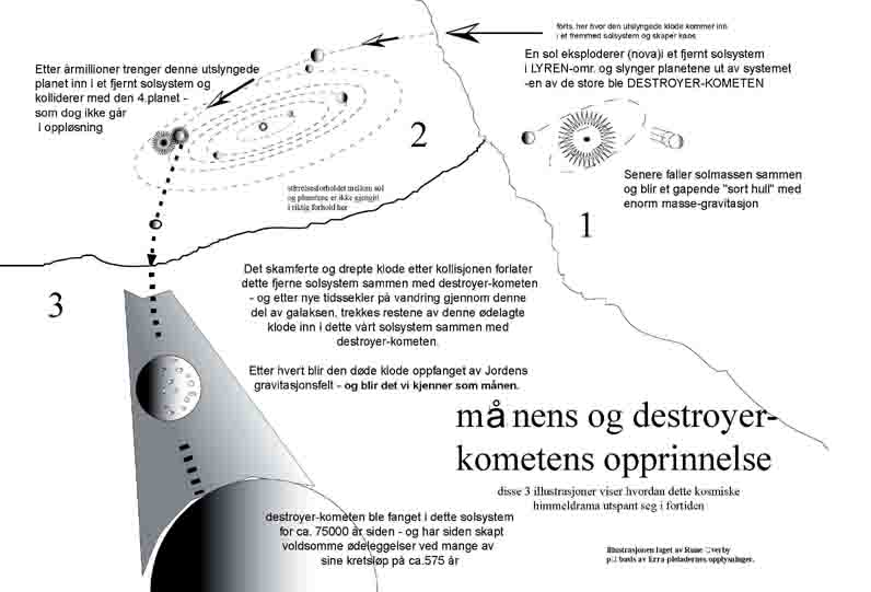 Videre forteller Semjase om opprinnelsen til denne "destroyer comet", som også senere frembrakte månen - som hun beskriver å være fragmentet av en småplanet, som er 4,5 millioner år eldre enn Jorden, og vi fortsetter derved direkte fra kontaktberetningen videre.(Etter Apollo-ferdene fant man månematerie med beregnet alder på 4,5 milliarder år! Se også det senere avsnitt om Jorden uten månen i stoffet om Velikovsky. )