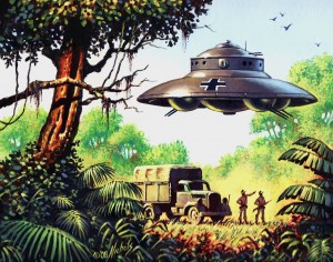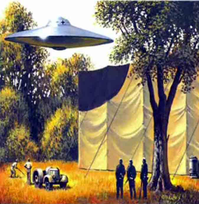 «På slutten av krigen hadde nazistene ni hemmelige forskningsanlegg, hvor de bygget to typer disker: det minste «Vril»-fartøyet, og den mye større «Haunebu». Begge disse ble drevet ved hjelp av et «null-gravitasjonsfelt». I test-flyvninger steg disse fartøyene 60.000 fot på kun seks og et halvt minutt, hvilket radikalt overgikk hva de alliertes fly kunne utføre.» Så merkelig det enn høres, så påstår Stevens at disse fartøyene ble brukt kun en gang mot de allierte, der de uten sidestykke fullstendig utmanøvrerte et bombeflyraid på 800 fly over Tyskland, og skjøt ned 200 bombefly i løpet av en natt. Men tilsynelatende hadde utviklingen kommet for sent til å redde Det tredje riket, og nazistene besluttet at det var bedre å forsøke å benytte denne teknologien etter krigen, i et forsøk på å etablere et Fjerde rike. Stevens mener at på tross av usedvanlige forsiktighetsregler fra nazistenes side, gjennom å ødelegge både forskningsanlegg og alle eksisterende bevis, så klarte både russerne og amerikanerne å kapre både arbeidstegninger og nok vitenskapsmenn til å grunnlegge sine egne flyvende diskos-program. Jordiske UFOer Gitt betydelige bevis for at visse grener innenfor regjeringen i hemmelighet har bygget flygende diskos-formede fartøy, blir spørsmålet hvor mange UFO-observasjoner verden rundt er utenomjordiske, og hvor mange representerer vår egen oppfinnsomhet? Stevens mening om dette temaet ble endret etter private samtaler med Stan Deyo - en «skyggefigur» som påstår å være ledende konsulent i området- gravitasjonsbaserte fremdriftssystemer. "Jeg møtte Deyo første gang da han kom til Laughlin-konferansen for å holde foredrag," forklarer Stevens. "Han er en meget suksessfull forsker innen utvikling og konstruksjon av gravitasjonsbaserte fremdrifts- systemer, og arbeider for den amerikanske regjeringen som konsulent på ulike steder, inkludert den notoriske basen i Pine Gap, Australia." Her mener Stevens at både England, Frankrike, Vest Tyskland og USA deler en hemmelig base, for å bygge og teste denne fantastiske UFO teknologien. "Jeg var målløs da Deyo informerte meg om at han var sikker på at rundt 40% av alle UFO-observasjoner kan tilskrives jordisk produserte fartøyer, og er observert av uinformerte vitner. Han påsto at USA hadde ett funksjonelt fartøy av denne typen allerede så tidlig som i 1958, og fløy kaprede tyske disker før den tid. Jeg spurte Deyo hvordan de kunne holde noe som dette skjult så lenge, og han svarte at for det første hadde autoritetene som var ansvarlige for disse programmene sin en egen kommandolinje - de var ikke ansvarlig overfor noen, unntatt seg selv. For det andre, var alle de ansatte karrierepersoner, og bokstavelig talt ansatt i jobben på livstid. Denne jobben var ikke noe du kunne forlate. For det tredje var incentivene uhyre store, og straffen var permanent."