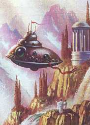 INSIDE THE SHIP We were standing before a vessel of tubular shape, some three hundred and fifty feet long by about sixty feet wide (100x20m). A broad platform led from the ground to the interior. As we approached, a man of medium height, but very broad, came down to meet us. He touched his heart to the Tall One, and for a moment they looked at each other while a message passed between them. Then the Broad One turned to us and beckoned (gjøre tegn) for us to follow him. We, following the example of my Guide, the Lama Mingyar Dondup, turned first to the Tall One, touching our right hand to our heart before bowing and turning away to follow the Broad One. The unknown is always fearsome. My own heartbeat increased in tempo as we walked up the sloping ramp, paused a moment, and entered that alien doorway. Inside was a long corridor, pale restful green in colour, and the walls appeared to be luminous. The light was uniform, and there were no shadows. The Broad One led us along the corridor for several yards, then stopping, he raised his hands and a portion of the wall slid aside to reveal a pleasant room on one side, and the floor of which appeared to be so transparent, that we were almost afraid to enter. "Have no fear." he said, " the floor is very solid and will bear you safely. What you actually see is a special screen, which shows all outside. There are no windows here." We gasped, and entered hesitatingly: it was as if we were walking on nothing and I certainly had the impression that I would fall through to the ground. The Broad One faced a wall and seemed to become remote from us as if he were deep in thought for a time. I stood idly gazing through what I had thought was a transparent floor, but now knew to be a special screen. I watched other vessels nearby, and people working on them. Suddenly my knees felt weak with terror. Things were moving further away: the ground was dropping beneath us, and I expected us to fall as well, but there was no sign, no sensation of motion. The Broad One came out of his seeming reverie and spoke. "We are going to take you out of the earth." he said. "We are going to show you your earth from afar." I replied. "But we are not moving. If we were we would feel something. When I swung at the end of a rope, or when I flew in a kite I certainly felt. But here there is no sensation." The Broad One replied, "No, there is no sensation, but we manoeuvres at speeds beyond the ability of any flesh and blood to withstand, and we have special devices which automatically neutralise the effect of sudden turns or of too high speed stops. You will feel nothing whatever in this ship, nor is there anything for you to worry about. We have long ago mastered the science of gravity. Later you shall see through this ship, but first--" He gestured with his hands toward the screens. We looked… NO SENSATION OF MOTION Far beneath us the rugged land that was Tibet was sinking. The mighty mountains, some towering higher than the much-vaunted Everest, were becoming flattened by the distance, becoming just pimples on a plain surface. We rose higher and higher until at last we could see our Happy River (as we Tibetans call it) swelling out into the mighty sacred river of India, out into the ocean, which we had not seen before. We saw the outline of the coast and could easily distinguish the Bay of Bengal, and see far into China. We could even see the Great Wall of China as a thin crack across the ground. The sun seemed to be below us, huge, swollen by the refraction (lysbrytning) of the air, glowing red like the open mouth of a lamasery furnace. Still there was no motion, no impression of anything. We stood and watched, and thought how utterly remote was all this from our normal life upon the arid (tørre) earth. The Broad One gestured (pekte) to a wall. He touched something and bench-like seats sprang from the previously smooth surface. "Sit down," he said. We can see more comfortably sitting." We sat, rather gingerly (med stor varsomhet) and rather embarrassed (brydd), because as we sat down we seemed to sink into something which gripped our shrinking forms through our thin robes. "Form-fitting seats," said the Broad One. "Very comfortable. They prevent you from slipping off yet they yield to every movement." Form-fitting indeed, thought I. Certainly I am not used to being held in this manner. Still, I suppose I wall get used to it. Now safely seated. I gazed again at the screens and held my breath in sheer amazement. I had been taught that the earth was flat, now I knew better - because I could see myself that the earth was round globe like the ball with which I used to play. Here we were, far up above the earth, going higher and higher, until at last we were completely free of the atmosphere. The earth turned slowly beneath us, a huge globe largely covered by the grey-green of the ocean. The land masses appeared insignificant, with splotches of green and russet (grovt, rødbrunt hjemmevevd stoff). Large areas of it were covered with white fleecy clouds -obscuring much of the surface. Through gaps we could see the outline of Continents and islands. We could see inland lakes, but of cities there was no sign. From our height there was no indication whatso ever that there was life upon Earth.