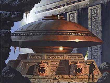 art JAMES NICHOLS Part One (Comment: it seems that this adventure happend well before second world war) The Home of the Gods Flying saucers? Of course there are flying saucers. I have seen many both in the sky and on the ground, and I have even been for a trip in one. Tibet is the most convenient country of all for flying saucers. It is remote from the bustle of the everyday world, and is peopled by those who place religion and scientific concepts before material gain. Throughout the centuries the people of Tibet have known the truth about flying saucers, what they are, why they are, how they work, and the purpose behind it all. We know of the flying saucer people as the gods in the sky in their fiery chariots. But let me relate an incident which certainly has never been told before in any country outside of Tibet, and which is utterly true. The day was bitter. Frozen pellets of ice driven by the howling gale(storm), hammered like bullets into our flapping robes and tore the skin off any exposed surface. The sky was a vivid purple with patches of startlitling (fylte) white cloud which raced off into the hinterland. Here - nearly thirty thousand feet above the sea, in the Chang Tang Highlands of Tibet, we were toiling upwards, upward. At our last resting place - some five miles behind us - a voice had come into our consciousness: "Strive on, my brothers. Strive on, and enter the fog belt again, for there is much for you to see." The seven of us, all high lamas from the lama-series of Tibet, had had much telepathic communication with the Gods of the Skies. From them we had learned the secret of the chariots, which sped swiftly across our land and which sometimes alighted in remote districts. Onwards we climbed, higher, and higher, clawing a foot-hold in the hard earth, forcing our fingers into the slightest crevice (sprekk) in the rocks. At last we reached the mysterious fog belt again, and entered. Soon we were through it and into the wonderfully heated land of a bygone age. (Remark: he writes much about this fogbelt (nb-norwegian on link) in other books - see for instance THE THIRD EYE - and it is formed of vulcanic heat in the high mountains that has melted the snow in a local area - but the extreme cold in these elevations - bring the vapour to condensate - and forms this hiding fogbelt on the outer limits of this volcanic aera.)"A days march more, my brothers," said the voice, "and you shall see a chariot of old." For that night we rested in the warmth and comfort of the Hidden Land. We found ease and relaxation on a soft bed of moss, and in the morning we gratefully bathed in a warm, broad river before setting out on another days march. Here in this land there were pleasant fruits which we took with us for our meal, a satisfactory change indeed from the eternal tsampa: Throughout that day we journeyed upwards through pleasant trees of rhododendron and walnut, and other the like of which we had not seen before. All the time we were rising upwards, and all the time we were in this pleasant warm land. With nightfall upon us we made our camp beneath some trees, and lit our fire, then rolled ourselves in our robes, and fell asleep. With the first light of dawn we were again ready to continue our journey. For perhaps another two to two and a half miles we marched, and then came to an open clearing. Here we were stopped, dumbfounded (stumme av forbløffelse) with amazement; the clearing before us was vast, and incredible. The open plain we saw was perhaps five miles across, and the scene was so strange that even now I hesitate (nøle) to write because of the knowledge that I shall be disbelieved. The plain was about five miles across and at its distant side there was a vast sheet of ice extending upwards, like a sheet of glass reaching toward the heavens. But that was not the strangest thing before us, for the plain contained a ruined city, and yet some buildings were quite intact. Some buildings, in fact, looked almost new. Nearby, in a spacious courtyard, there was an immense metal structure which reminded me of two of our temple dishes clamped together and it was clearly a vehicle of some sort. My guide, the Lama Mingyar Dondup, broke our awed silence, saying. "This was the home of the Gods half a million years ago. During those days men strove against the Gods, and invented a device to shatter an atom, which wrought disaster on the earth, causing lands to rise and lands to sink, destroying mountains and creating anew. This was a mighty city, the metropolis, and here was once the sea-shore. The convulsion (krampetrekninger) of the earth, which followed, and the explosion - raised this land thousands of feet, and the shock of that explosion altered the rotation of the earth. We shall go closer, and we shall see other parts of the city embedded in the ice of the glacier- -a glacier which, in this hot valley, has gently melted - leaving intact these ancient buildings." We listened in fascinated silence, and then, as if by one common impulse, we moved forward. Only as we came close to the buildings, did it become apparent to us that the people who had lived here must have been not less than twelve feet tall. Everything was on a giant scale, and I was forcibly reminded of those huge figures which I had seen deep in the hidden vaults of the Potala. (Remark: he writes much about this (norw.link) in other books - see for instance THE THIRD EYE. The same - and more detailed information on this is given through the direct contacts to the pleiadian ET - Semjase - and also through channellings through Lyssa Royal Holt. R.Ø.remark.)We approached the strange vehicle of metal. It was immense. Perhaps fifty or sixty feet across, and now dulled with age. We saw a ladder extending up into a dark opening and, feeling as if we trod sacred ground, we crept up, one by one. The Lama Mingyar Dondup went first and soon disappeared into the dark hole. I was next, and as I reached the top of the ladder and steppe