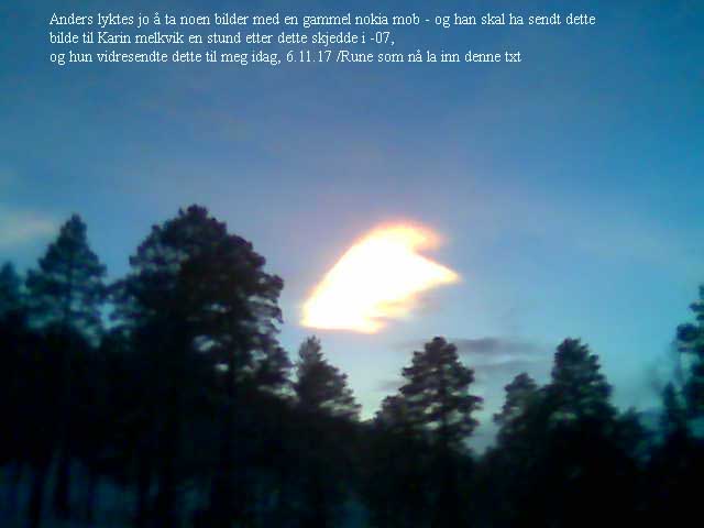 Anders (Anders Klev, Snåsa) sendte meg et bilde over området som jeg kunne bruke til å illustrere hendelsens første akt - det som gikk forut for landingen. TIPS; FOR å høre /oppfatte budskapet i lydfilene under på videoene, så anbefales å bruke øretelefoner for slik å få lyden - som kan være vanskelig å oppfatte på den nordtrønderske 'snåsa-dialekt' - rett inn i øret. The contactee sent me a picture where it happend, and I have inserted the 'cloud-ship' into it - from his explanations. |