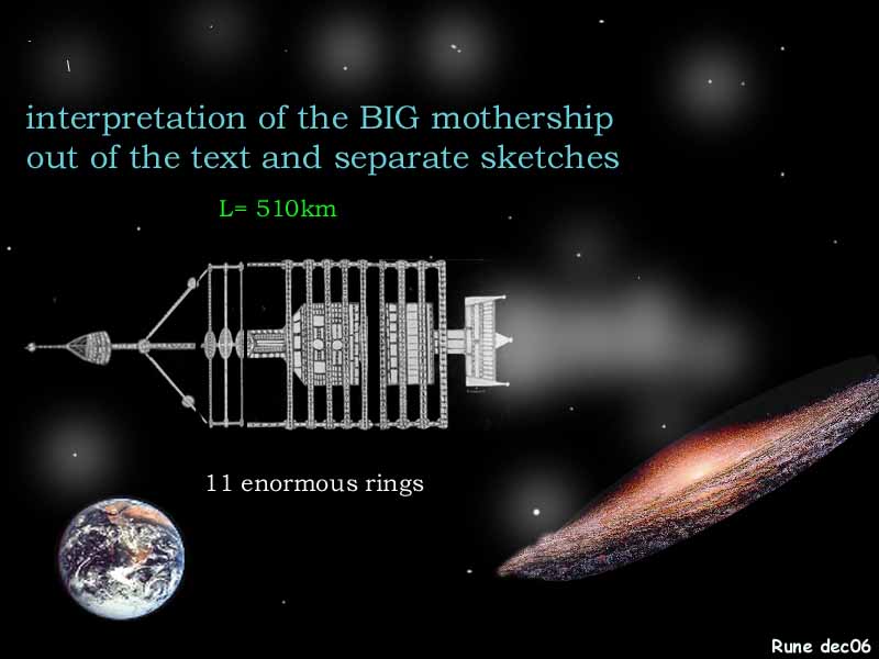 They told it could travel through dimensions* with that ship, which had a lenght of 510km!(and that was not of the biggest!) "Each of the 11 rings have within them whole complete worlds of being within themselves. The mothership houses about 1,5million beings with highly differentiated view of life and culture. Their life-systems are big enough to provide native environments for each of the hominid races as it exists on their original home planets."