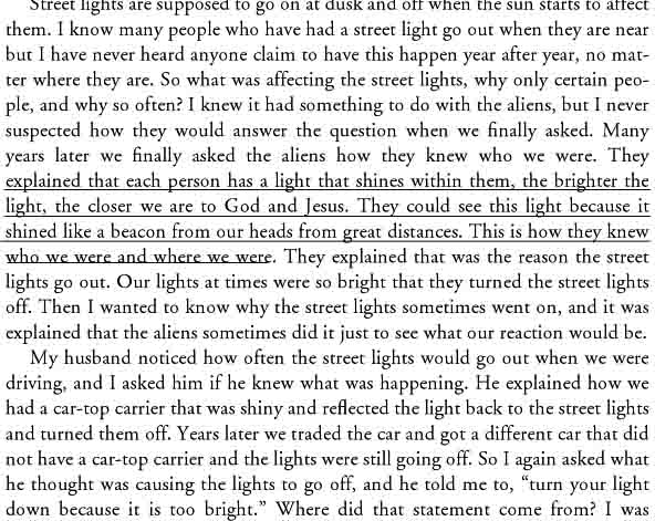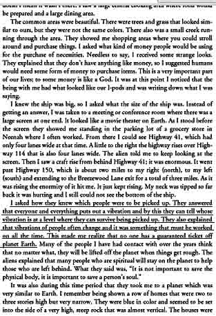 From page 54 she tells of her trip with them -  but seemingly not thru the physical body?As was taken directly thru the wall/window?  She was visited by 3 light-beings that took her out in a ship just outside, which again brought them to a bigger ship – BIG as a city!! When they came and "took her", it was a car passing by that seemingly not saw them, which is natural is they were raised in frequency above the physical vibration. (or as other tell of; magnetic 'screened' from normal sight - fx in the contact of Ante Jonsson in Sweden in the80s)