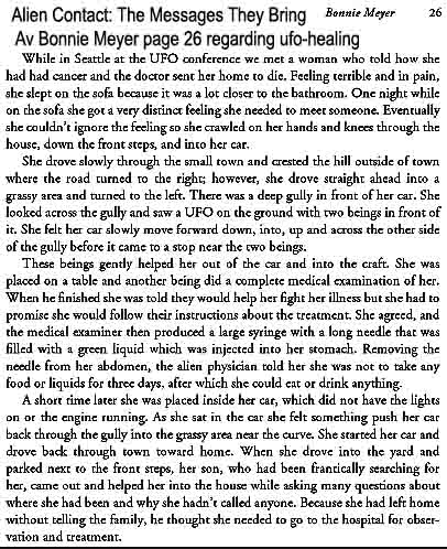 about Bonnie's missing time experience, and later, on page 45 in her book online, she tells of the hypnotic regression that brought forth what happend then, under the 'missing time' period decriben below (color marked)