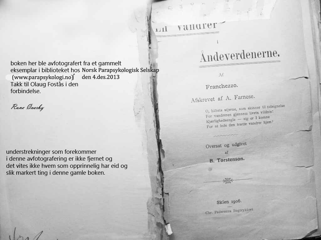 EN VANDRER I ÅNDEVERDENERNE - er oversatt og utgitt av cand. jur. Bernt Torstenson og muligvis brukte den danske oversetter av denne under, nettopp Torstensons oversettelse som grunnlag- da det jo er ganske minimalt som skiller de to språk, slik de var for hundre år siden.
