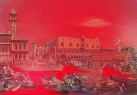 Vi befant oss nå i byen og gav oss til å spasere langs hovedkanalene, for at jeg kunne få palassene å se. Ja, dér var de, disse fordervede kopier av alle de smukke steder, som berømte malere hadde gjort en så fortrolig med. Deres ry innrisset hver for seg en nisje i historiens tempel. Men her fløt kanalene som mørkerøde strømmer av blod, som liksom strømmet ut fra uhyre slaktehus, hvor det rislet og plasket opp av palassenes marmortrinn og etterlot en fet skittent farve; selv steinene i bygningene og brolegningene syntes å svette blod. Luften var tung av den røde fargetone. Dypt nede i de karmosinrøde vande så jeg skikkelser i tusental, som lignet beinrader av drepte eller snikmyrdet, og som hadde funnet deres graver her nede. I fengslenes undergrunn, som lignet huler under hele byen, så jeg ånder som var stuvet sammen som ville dyr - jeg så tigerens villskap i deres stikkende øyne, og den menneskelige tyranns hevngjerrige ondskap manifesterte seg i disse krypende skikkelser.