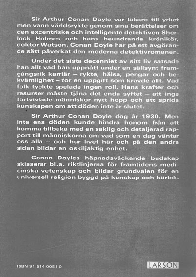 InledningNär jag var pojke såg jag varje månad fram emot att en tidskrift skulle komma ut, som på omslaget hade en bild av the Strand i London med en droska i förgrunden och en lång rad med andra hästdragna åkdon. I tidskriften hittade man berättelser av en viss Arthur Conan Doyle vilka handlade om Sherlock Holmes' äventyr, enligt vad man påstod meddelade av en Dr Watson. Föga anade jag att här, inför mina ögon hade jag så gott som de första och säkerligen de bästa av alla detektivhistorier, som inga andra skulle kunna mäta sig med och ännu mindre överträffa i den uppsjö av liknande historier som de gav impulsen till. Arthur Conan Doyle föddes i Edinburgh den 22 maj 1859 och dog den 7 juli 1930. Under sitt sjuttioettåriga, intensivt verksamma liv skrev han omkring fyrtio medelstora böcker, åtskilliga teaterpjäser, en historisk skildring av boerkriget i Sydafrika, ännu en om första världskriget i sex delar och därtill otaliga noveller, alltid av samma höga litterära klass. Hans fysiska prestationer var inte mindre märkliga. Han var styv boxare, spelade cricket, var en av pionjärerna i bilismens barndom, skicklig i att spela biljard och den som introducerade längdlöpning på skidor i Schweiz. Medan en vanlig människa bara existerar till hälften, levde denne man hela sitt liv med intensiv, hundraprocentig energi och entusiasm. Under sin sista sjukdom sysselsatte sig Sir Arthur med en teckning som han kallade ’Den gamle hästen’ - föreställande honom själv som den gamle hästen som drog det väldiga lasset med allt som han uträttat i livet, längs en väg där viktiga händelser under hans levnadsbana prickades in som milstolpar. Dessa händelser omfattade hans skoltid och universitetsår, hans upplevelser ombord på ett valfångarfartyg, hans praktik som läkare, hans äventyr som bergbestigare, som politisk valtalare och som förespråkare för spiritualismen - en serie om femhundra föreläsningar - under resor över hela världen, allt uppstaplat till en kolossal höjd på vagnen. Det hela kröntes med ett arrangemang av golfklubbor, boxhandskar, ett cricketslagträ, biljardköer, skidor och andra grejor! Bilden var en sammanfattning av hans liv. Och ändå innehåller det lass som den gamle hästen drar obetydligt från den verksamhet åt vilken han offrade allt han ägde i fråga om energi, hälsa och tillgångar och som till slut förkortade hans liv. Denna mission kom honom att försaka nästan allt han uppnått i livet - ekonomisk trygghet, lugn, bekvämlighet, hemliv, uppskattning och berömmelse - till och med en högadlig värdighet som erbjöds honom - och detta för en misshaglig övertygelse som krävde allt han hade kvar att skänka livet. Vi får veta i hans böcker att han varit intresserad av psykisk forskning i många år. Han hade undersökt hus där det spökade och några fall av poltergeist -fenomen och råkat ut för häpnadsväckande upplevelser. Han säger: - Med utgångspunkt från en ganska grundmurad materialism, hade jag åtminstone blivit mottaglig för intryck och fortsatte mina undersökningar under ett liv med mycket knappt utmätt fritid. - Men när kriget kom, fortsätter han, uppväckte det ett stort allvar i allas sinnen och fick oss att mer ingående granska vår egen tro och att pröva dess hållfasthet. Mitt i en plågad värld där man varje dag fick bud om hur blomman av en hel generation stupade på tröskeln till sin löftesrika ungdom, där man såg hustrur och mödrar överallt utan någon klar uppfattning om varthän den älskade hade gått, tycktes jag plötsligt inse att undersökningen av de icke -fysiska krafterna - det ämne som jag så länge hade roat mig med - inte enbart var ett studium vid sidan om de normer som gällde inom vetenskapen, utan att det verkligen var fråga om något oerhört, om en forcering av murarna mellan två verkligheter, om ett direkt budskap från en annan värld, omöjligt att förneka - ett anrop som innebar hopp och ledning för mänskligheten under en tid av den svåraste hemsökelse. I ovanstående stycke avlade Conan Doyle oförfärat sin trosbekännelse och betonade sin övertygelse att här låg det mest betydelsefulla av alla ämnen tillgängligt för människan att studera. Arthur Conan Doyle var då den högst betalde av alla novellförfattare - hans honorar var tio shillings per ord. Men nu måste han avstå från sina inkomster utom det han förtjänade på en enstaka novell då och då. Han tillät sig inte att skriva några fler böcker, utom om psykiska företeelser - med själens fortsatta liv efter döden som tes.