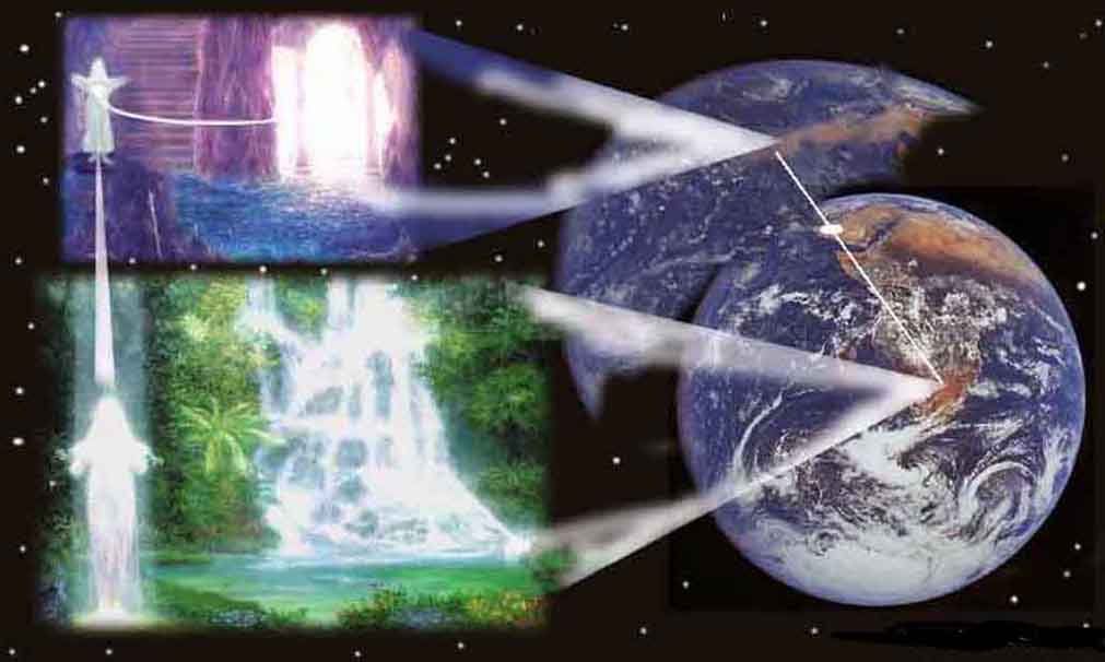 Bildet viser et menneske på det jordfysiske plan og dets forbindelse til et av sine høyere åndelige legemer som befinner seg i et av klodens finstoffelige/åndelige plan som ligger som "plan/verdener" utenfor den fysiske klode og der stoffet har en høyere vibr.frekvens og noe andre naturlover virker. En interdimensjonell "UFO" er også inntegnet til høyre på linjen mellom dimensjonsplanene - med "teknisk"evne til å ferdes mellom flere av Jordens mange plan eller materie-frekvens-verdener. Spesielle vesener  - de såkalte "engler" - har denne samme evne - da de kan ferdes på mange plan i sitt naturlige virke. Men uten at de trenger vinger for aerodynamisk løft - de er kun auraens felter som clairvoyante kan se. Merk: de åndelige eller finstoffelige plan er like virkelige/"fysiske" når man ER på disse plan.