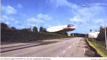 Såg det tydligt Vi krypkör längs vägrenen, precis som Jan Olsson gjorde vid observations tillfället. Det går sakta, knappt 30 kilometer i timmen. Till vänster ser jag den höga jordvall som följer raksträckan. Det är samma vall, vid en punkt några hundra meter längre fram, som planet ska ha försvunnit bakom. Det är inte mycket trafik så vi stannar bilen. - Jag såg tydligt hur planet kom över vägen. Vinkeln var skarp och planet dök nästan ner och försvann bakom vallen. Jag förväntade mig att se svart rök och eld, en krasch, och sneglade gång på gång mot mobilen som jag lagt på passagerarsätet. - När jag kom fram till stället där planet åkt över vallen tänkte jag stanna bilen och springa uppför slänten men just som jag skulle stanna bilen kom flygplanet tillbaka. Den här gången kommer det upp bara någon meter över vallen och glider fram över vägen. På väg tillbaka på den kurs det nyss kom från. För Jan Olsson blir det hela ännu märkligare. Hur kunde planet vända och komma tillbaka på samma ställe? Det har knappt varit ur sikte mer än någon minut. Känslan han får är att planet kör mycket sakta och nu ser han flygplanskroppen väldigt tydligt. Den är långsmal med en vinge. Vingen ser tunn och smal ut och har en mycket böjd form. - Vingen var formad som en hästsko. Den var placerad en bit framför mitt-punkten och svängde runt mot bakdelen av planet.