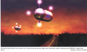 Från UFO-AKTUELLT 2/15. Ett tub format föremål med utskott och röda blinkande lampor sågs över Stenstorp mellan Falköping och Skövde i september Illustration: TOBIAS LINDGREN