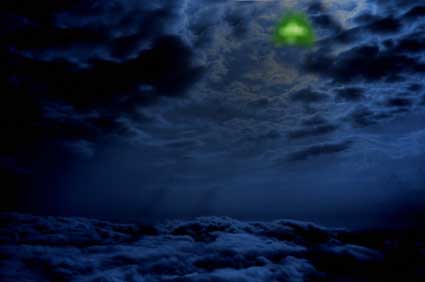 ill.rune øverby Det gula ljuset pulserade med cirka en sekunds intervaller under hela observationen. Däremot fanns inte det starka ljuset som belyste marken kvar. Ett tredje ljus syntes dock komma från glipan molnen. Det beskriver Katrine som ett blått ljus som sköt ut som i en ljuspelare horisontell riktning ur molnglipan och gick jämte molnen. Katrine själv tolkade det hela som att det ljus som tidigare lyst upp hennes man och omgivningen kring äppelträdet nu var riktat horisontellt ut ur molnglipan istället. I uppskattningsvis en till två minuter står Katrine och hennes man och observerat det egendomliga fenomenet innan det helt plötsligt försvinner utan förvarning som när man släcker en lampa. En kort stund därefter så tätnar glipan i molnen och då ser Katrine fyra vita spiraler i en fyrkantsformation under glipans plats i molnen. Spiralerna påminde om kondensationsstrimmor och Katrine tänkte då omedelbart att det måste ha varit en farkost som släppt ut vattenånga i atmosfären. Spiralerna löstes sedan sakta upp och molnglipan tätnade helt. Allt var som vanligt igen. Inget som helst ljud hördes under observationen och ljusfenomenet var hela tiden stillastående. Storleken har Katrine svårt att uppskatta men uppger att det möjligtvis var som en halvmåne. Katrines uppfattning var att ljusfenomenet måste ha befunnit sig ovanför molnen. Utgår vi ifrån att den uppfattningen är korrekt så måste föremålet ha befunnit sig på minst strax över 1500 meters höjd då molnbasen över Örebro med omnejd låg på den höjden under hela kvällen den 18 september 2008. Observationen gjordes i sydvästlig riktning (in mot centrala Orebro) i uppskattningsvis 45 graders höjdvinkel vilket gör att månen med lätthet kan avfärdas då den befann sig i öster vid tiden för observationen. Vad det var för fenomen som gav upphov till observationen är i nuläget oklart och händelsen kommer att utredas vidare under årets gång.