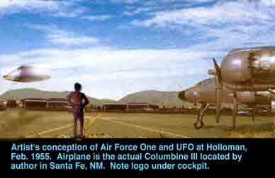 "Charlie's father, Navy Commander Charles Suggs accompanied Pres. Ike along with others on Feb. 20th. They met and spoke with 2 white-haired Nordics that had pale blue eyes and colorless lips. The spokesman stood a number of feet away from Ike and would not let him approach any closer. A second nordic stood on the extended ramp of a bi-convex saucer that stood on tripod landing gear on the landing strip. According to Charlie, there were B-58 Hustlers on the field even though the first one did not fly officially till 1956. These visitors said they came from another solar system. They posed detailed questions about our nuclear testing." [Personal notes from William Hamilton from a 1991 interview with Commander Suggs son, Sgt Charles Suggs, Jr].