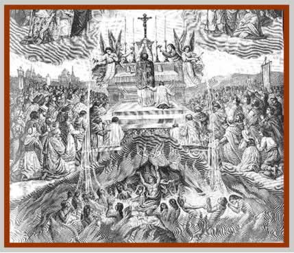 Det skal i sandhedens interesse siges, at det kun er i de såkaldt protestantiske samfund, at dette frygtelige onde forekommer i sin værste form. Med sin lære om skærsilden (bilde over og under) kommer den store romersk-katolske kirke forestillingen om astralplanet langt nærmere, og dens fromme tilhængere er i hvert fald klare over, at den tilstand, hvori de befinder sig kort efter døden, kun er midlertidig, og at det er deres opgave at bestræbe sig for så hurtigt som muligt at hæve sig over den gennem intens åndelig stræben, idet de samtidig accepterer enhver lidelse, de måtte komme ud for, som nødvendig, for at de kan komme af med ufuldkommenhe-derne i deres karakter og således blive skikket til at gå videre til højere og lysere regioner.