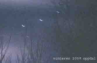 09.01.07. kl 16.45. Oppdal sentrum. En kommer ned retning nord øst. m. l. kl 1705. en liten gruppe over og rundt Quality hotell Oppdal. det gamle turist hotellet. F. nr 24-25. Kl 17.46 reiser fra Oppdal og nordover. der de er med, skifter med av og på lys. Kl 18.01. skogly setter på lyd på farkost. kretser over området flerre stk Kl 18.30 slå av lyd og går opp i posisjon. r. vest. kl 20.55. sirkler over med lyd flere stk Kl 21.40 slår av lyd. kl 23.02. kretser rundt med blinkende lys og en svak vislende lyd. 10.01.07.kl 13.20. to jagerfly fra nor sikler rundt og drar sør kl 13.33 fra sør til nord. kl 1340 –14.05. jagerfly sirkler rundt. kl 1650. de kommer ned en etter en. Kl 17.00.gruppen er samlet med lys. kl 17.50 –18 00. sirkler rundt med lyd. kl 21.40.slår på lys. kjører i sik sak. (slalåm) fra sør til nord. 11.01.07 kl 01.30..skogly en stk retning sør. lav høyde overskyet. kl 13.15.jagerfly over Oppdal kirke sirkler rundt område. kl 21.00-21.30.skogly to stk viser seg setter på lyd begynner å sirkle rundt overskyet. lav høgde. kl 23.40 en liten gruppe går i formasjon, setter på lys på en del. og slår av igjen sånn at det er bare tre igjen med lys på. Overskyet. 13.01.07. kl 16.30 S. Kommer ned en stk retn nord. Nord. øst.. video. H ca 400m kl 16.45 reiser til Oppdal sentrum. en etter en kommer de ned. varierende høyde. fra 700m til 200m. Retning sør og vest og nord. Retur fra Oppdal kl 17.19. en stk retning nord. en r. Nordøst og en nordvest, høyde fra 200m til 100m. Ankommer skogly kl 17.40. foto nr 26-27. overskyet. kl 19.30. gruppen er i formasjon N-S. Hyde ca 200m |