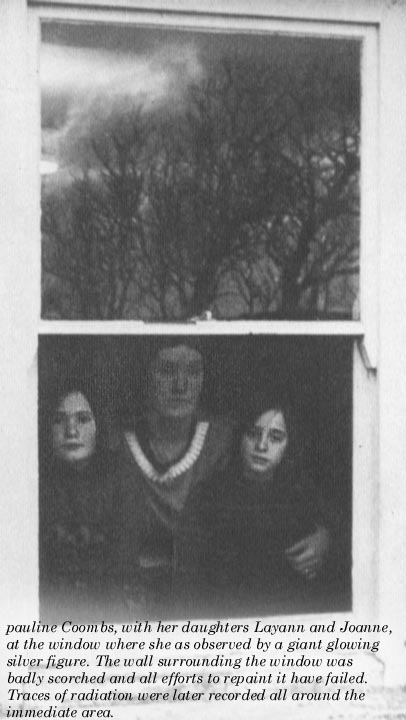 Næsten helt lammet af skræk så ægteparet nu uden for deres stuevindue omridset sølvfarvet og lysende menneskelignende skikkelse af utrolig dimension. Vinduet var 2,10 meter højt, men trods dette, kunne de kun se kroppen, armene og den nederste del af hovedet. Eller hvad var det de så? Var det en hjælm, bag hvilken gemte sig et udvisket ansigt? Fru Coombs var nær ved at besvime.