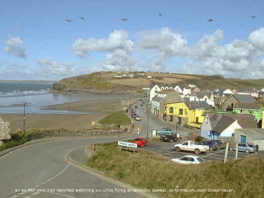 Pauline's reverie was broken by Keiron calling for her mum to look into the night sky. There it was. Back. She tried to dismiss it as 'just another star. But Keiron insisted it was swaying side to side. Her thoughts turned again to the fifty people who had reported Ufo's to the police recently. There were the two schoolboys who had seen a domed Ufo with pulsating green and yellow lights hovering over an office block in Haverfordwest. The same boys had approached a blue light in a field near their school which rose up and sped away when they approached. Even more strange were the fourteen school boys who saw a landed Ufo near their school. Two of the boys reported seeing a silver figure near the craft. All reported ten or eleven windows and a sort of runway leading from a door.
